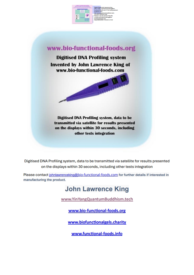 Invention number 1:  is the Digitised minimised DNA product, to make electrophoresis obsolete and give a full DNA profile on the fly via satellite; Suitable for any person(s) that needs to enhance your facial-recognition-data and hold on to your I.D. making it impossible for crooks to take your I.D. …. Appropriate for the Rich… and poor alike.